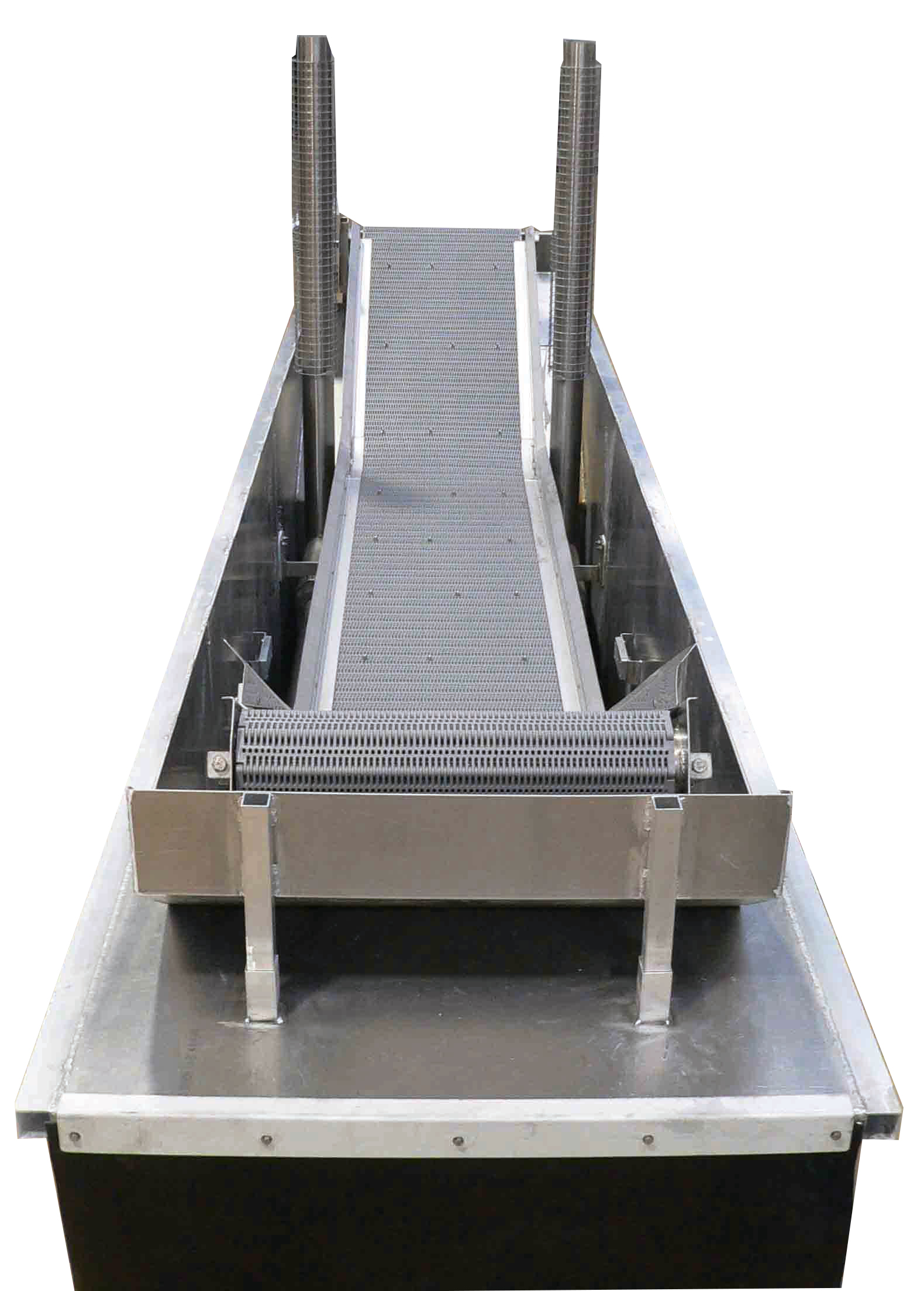 Un tapis en mouvement continu permet d’immerger 2 ou 3 secondes des poches, casiers ou paniers australiens ou huîtres en vrac avec le même temps de traitement.